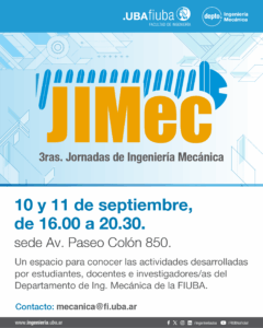 Querido/a colega, se vienen las III Jornadas de Ingeniería Mecánica (JIMEC III), a realizarse los días 10 y 11 de septiembre, 16 a 20.30hs en la sede Paseo Colón.