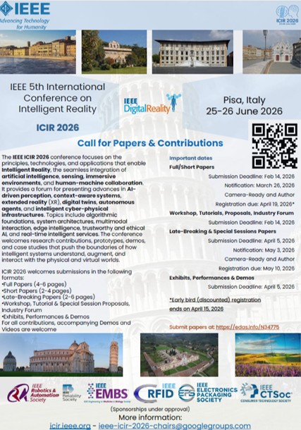 We are pleased to announce the IEEE 5th International Conference on Intelligent Reality (ICIR 2026) https://icir.ieee.org/, asset of the IEEE Digital Reality Technical Community (DRTC) (https://digitalreality.ieee.org/), which will take place on June 25–26, 2026, at the Aula Magna Pontecorvo, University of Pisa, in the historic city of Pisa, Tuscany, Italy.